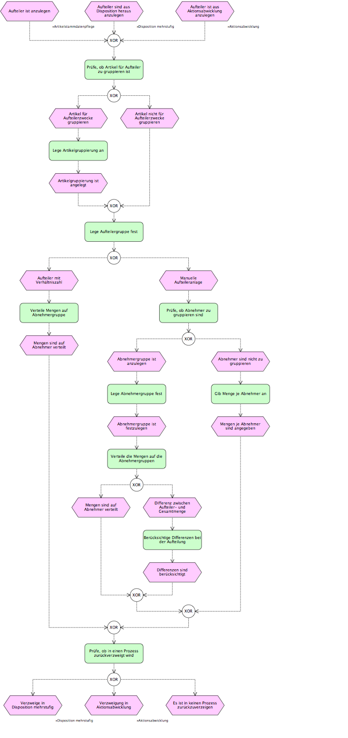 empfangener fluss: Aufteiler ist aus Aktionsabwicklung anzulegen -> Prüfe, ob Artikel für Aufteiler zu gruppieren ist, Aufteiler sind aus Disposition heraus anzulegen -> Prüfe, ob Artikel für Aufteiler zu gruppieren ist, Aufteiler ist anzulegen -> Prüfe, ob Artikel für Aufteiler zu gruppieren ist