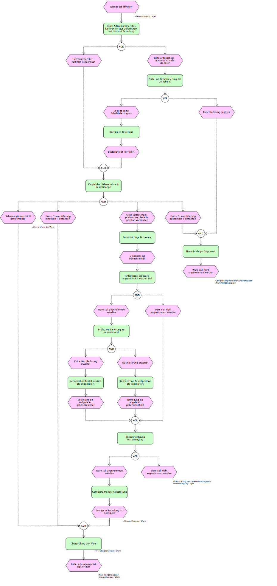 empfangener fluss: Benachrichtigung Wareneingang, Überprüfung Lieferscheinangaben, Benachrichtige Disponent